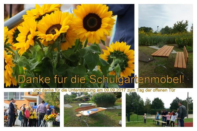 11. September 2017 - Zum Tag der offenen Tür brachte der Förderverein neue Gartenmöbel für den Schulgarten mit. Ein kleines Dankeschön erreichte den Verein einige Tage später... | 09. September 2017 - Heute fand der Tag der offenen Tür mit Einweihung der sanierten Turnhalle und dem neuen Außengelände statt. |