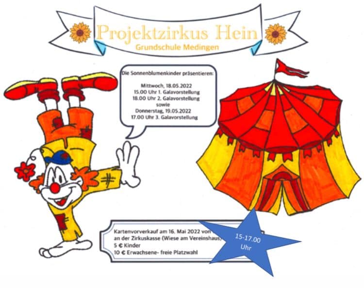 17. Mai 2022 - Projekt-Zirkus erfüllt Kinderträume in Medingen Schule mal anders: Seit Freitag steht ein Zirkuszelt auf dem Sportplatz in Medingen. Unter der Kuppel üben kleine Clowns und Jongleure für ihren großen Auftritt. | 15. Mai 2022 - Das Zelt des Projekt-Zirkus Hein ist schon aufgebaut... die Spannung steigt... Ein herzliches Dankeschön allen Helferinnen und Helfern!!! |
