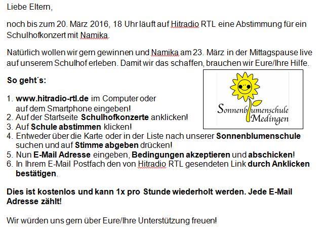 23. März 2016 - Ein kleiner Rückblick auf das Schulhofkonzert mit Namika an der Sonnenblumenschule Medingen. Nochmal ein herzliches Dankeschön an Hitradio RTL und Namika, sowie allen Helfern und Unterstützern!!! Ihr wart toll!!!! | 22. März 2016 - Das Schulhofkonzert mit Namika startet morgen pünktlich um 11.45 Uhr auf dem Schulgelände (Parkplatz) unserer Sonnenblumenschule. Da der Schulparkplatz nicht zur Verfügung steht, nutzt bitte die Wiesenflächen am Trafohaus neben der Schule und am Vereinshaus/Sportplatz Medingen für Eure "Autos". Das Schulgelände ist morgen autofreie Zone... |