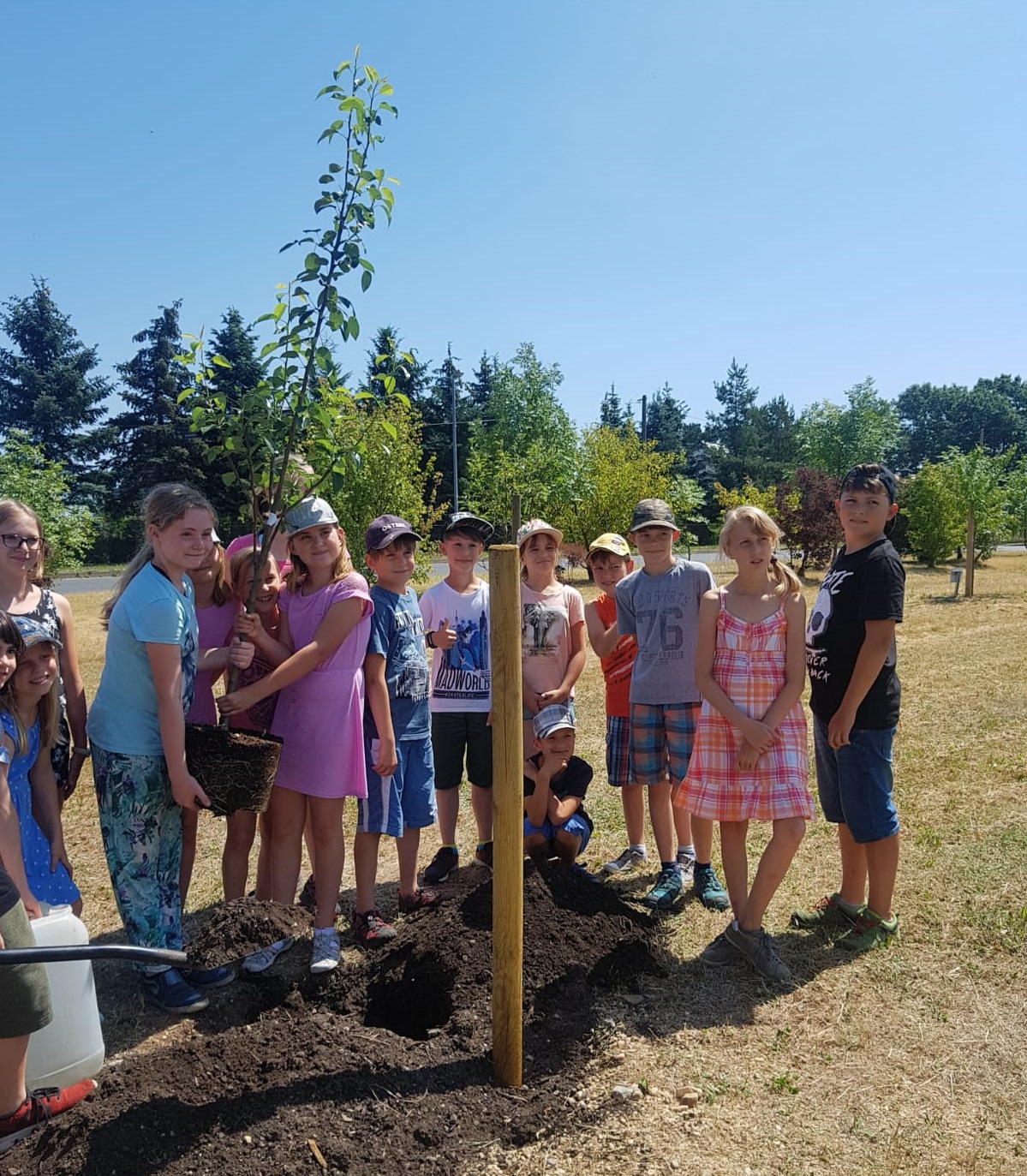 1. Juli 2019 - Wie doch die Zeit vergeht! Schon wieder verlässt uns eine 4. Klasse. Der Jahrgang 2018/2019 pflanzte traditionell ihren Abschiedsbaum auf der Obststreuwiese am Kleinen Grund. Viel Freude und maximale Erfolge auf euren weiteren schulischen Wegen! | 23. Juni 2019 - Der Fördermittelantrag für den letzten Bauabschnitt die Brandschutztechnische Sanierung des Sockelgeschosses mit Teilumbau zu Mediathek und Mehrzweckraum wurde genehmigt. Ministerpräsident Michael Kretschmer informierte den Schulförderverein über die positive Bescheidung. |