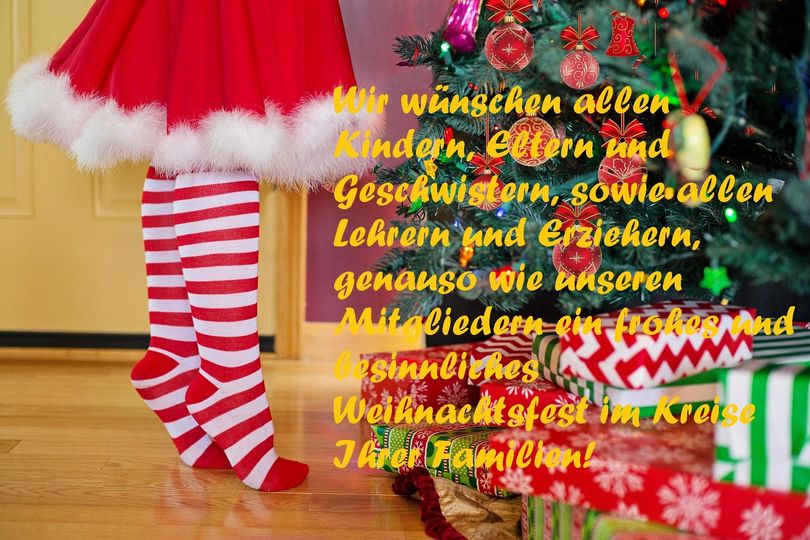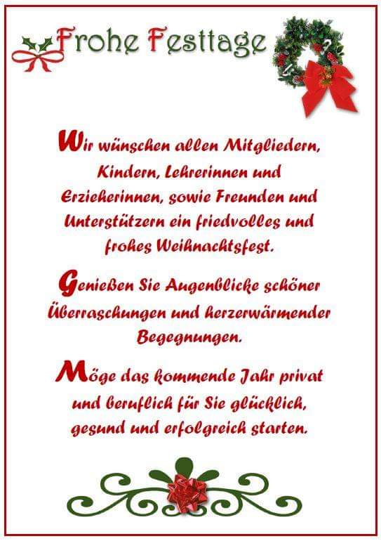23. Dezember 2018 - Wir wünschen allen Kindern, Eltern und Geschwistern, sowie allen Lehrern und Erziehern, genauso wie unseren Mitgliedern ein frohes und besinnliches Weihnachtsfest im Kreise Ihrer Familien! | |
