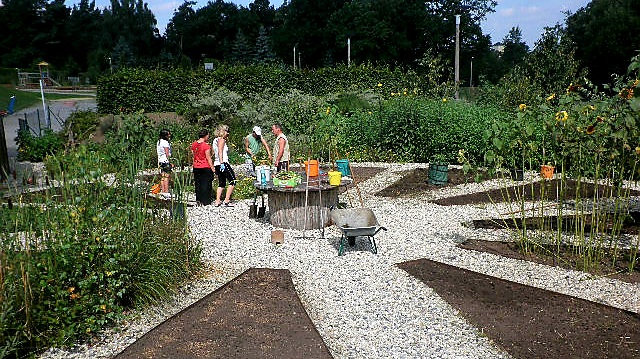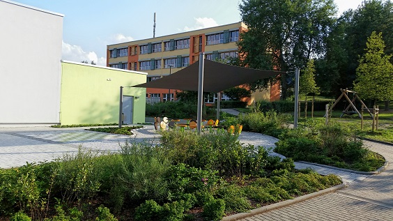 Pausenhof | Sitzgruppe mit Schaufeld und Tischtennisplatten |